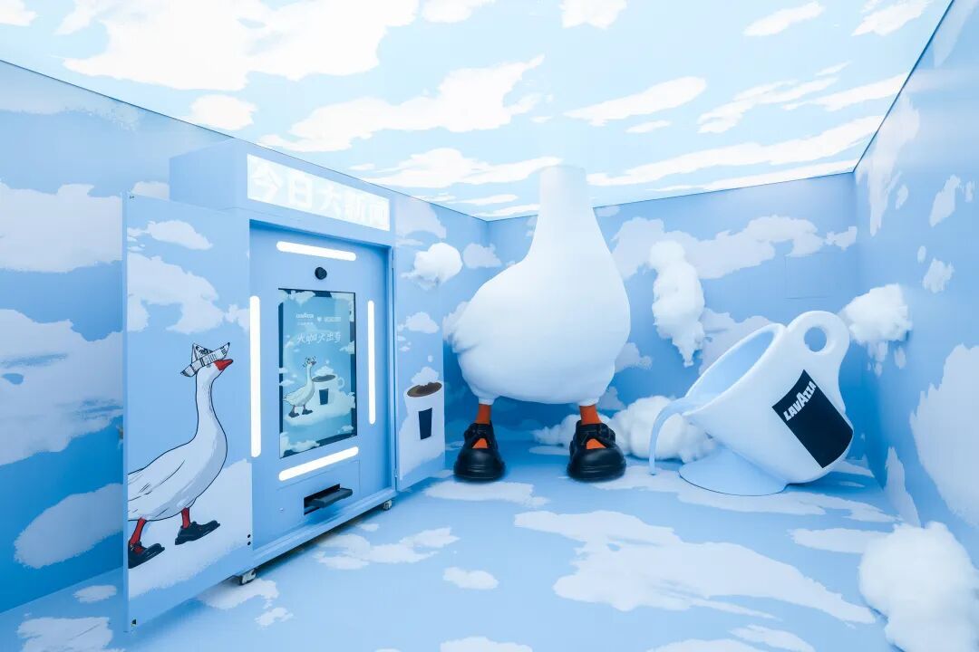 作为徐汇区代表性的潮流地标,安福路历来是上海时尚文化与街头艺术的汇聚地。此次限时五天的快闪活动,以蓝天白云为灵感的创意装置“点亮”街区。头戴Moschino标志性折纸船的大白鹅装置“漂浮”于街头“云端”,惬意地啜饮着Lavazza联名咖啡,独特的视觉设计不仅让徐汇安福路成为全城瞩目的打卡新地标,更让百年咖啡匠心与前卫时尚美学在徐汇的街头巷尾碰撞出奇妙火花。