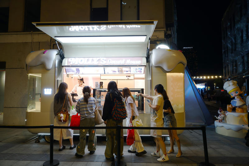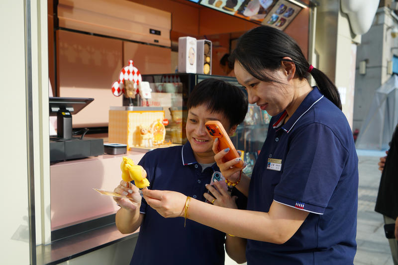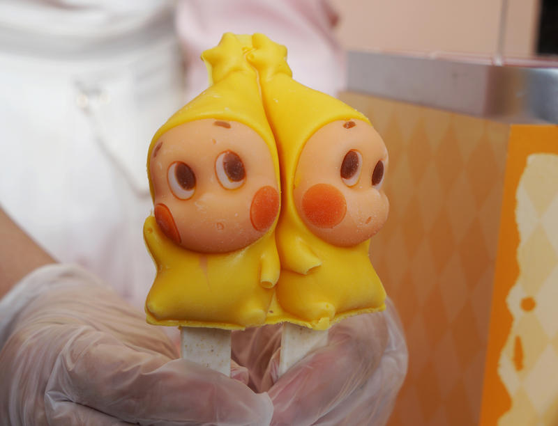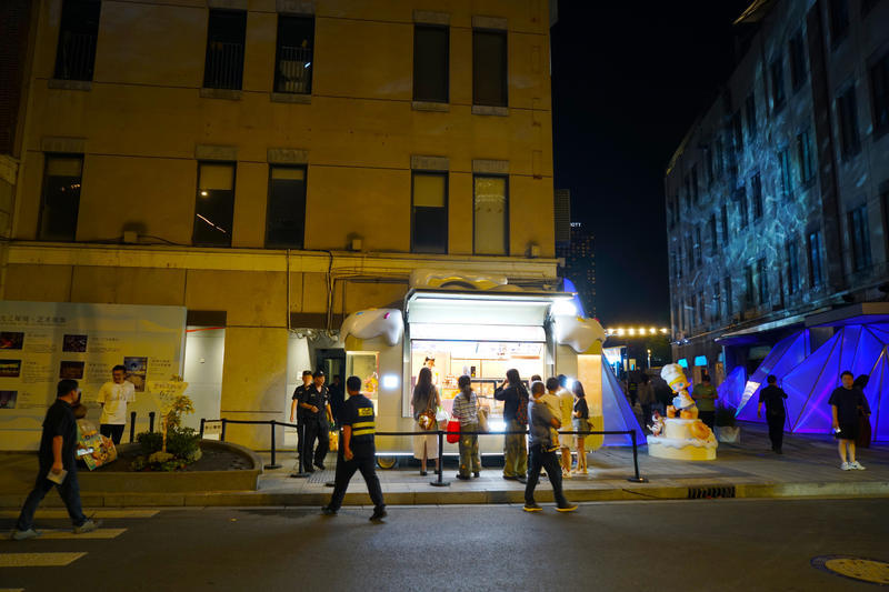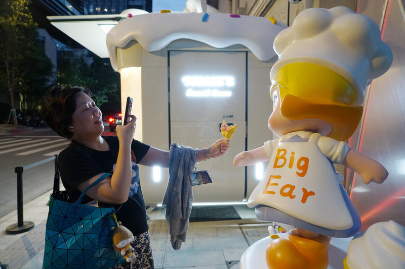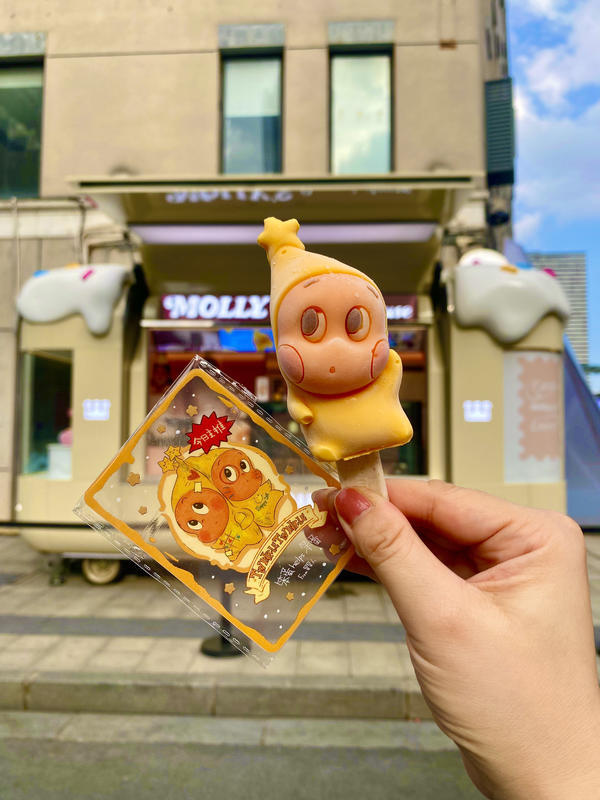 从中午到晚上,冰淇淋车这里总有人驻足停留。店员小姐姐说,周边大楼工作的白领有时候会买上一打十几支“星星人”冰淇淋,带回办公室人手一支。还有慕名而来的小年轻特地赶过来,就为了这黄色软糯的乖小囡。品尝、打卡、发朋友圈,一气呵成。
