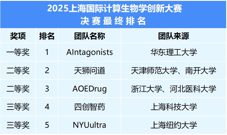 近日,作为2025上海国际生物医药产业周的重要环节,2025上海国际计算生物学创新大赛获奖名单重磅揭晓。来自华东理工大学的“AIntagonists(AI拮矿工)” 团队,从全球118支参赛队伍中脱颖而出,荣获一等奖。