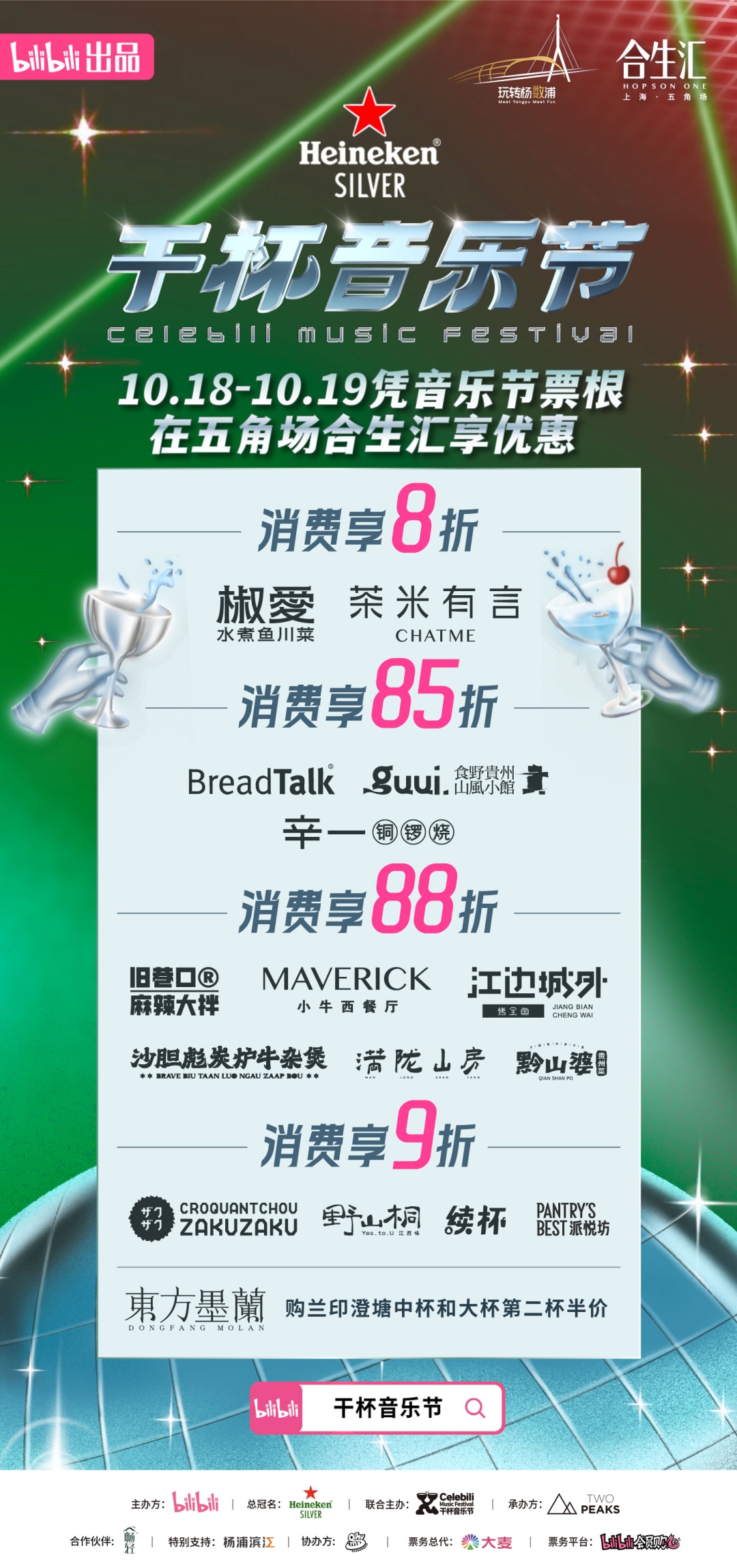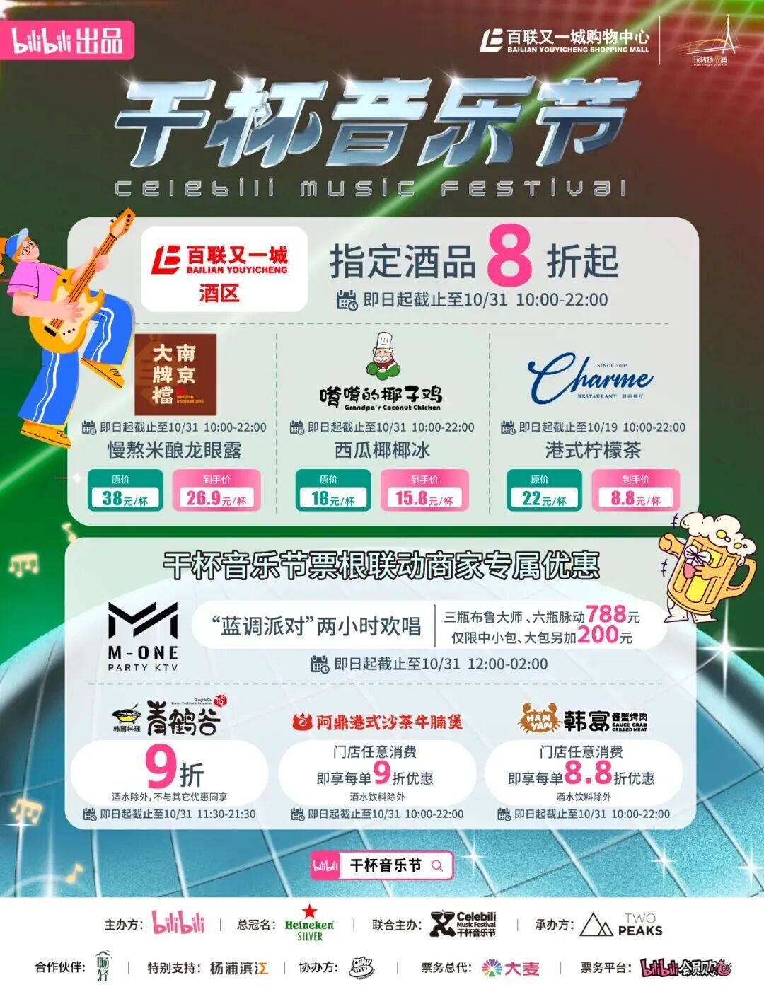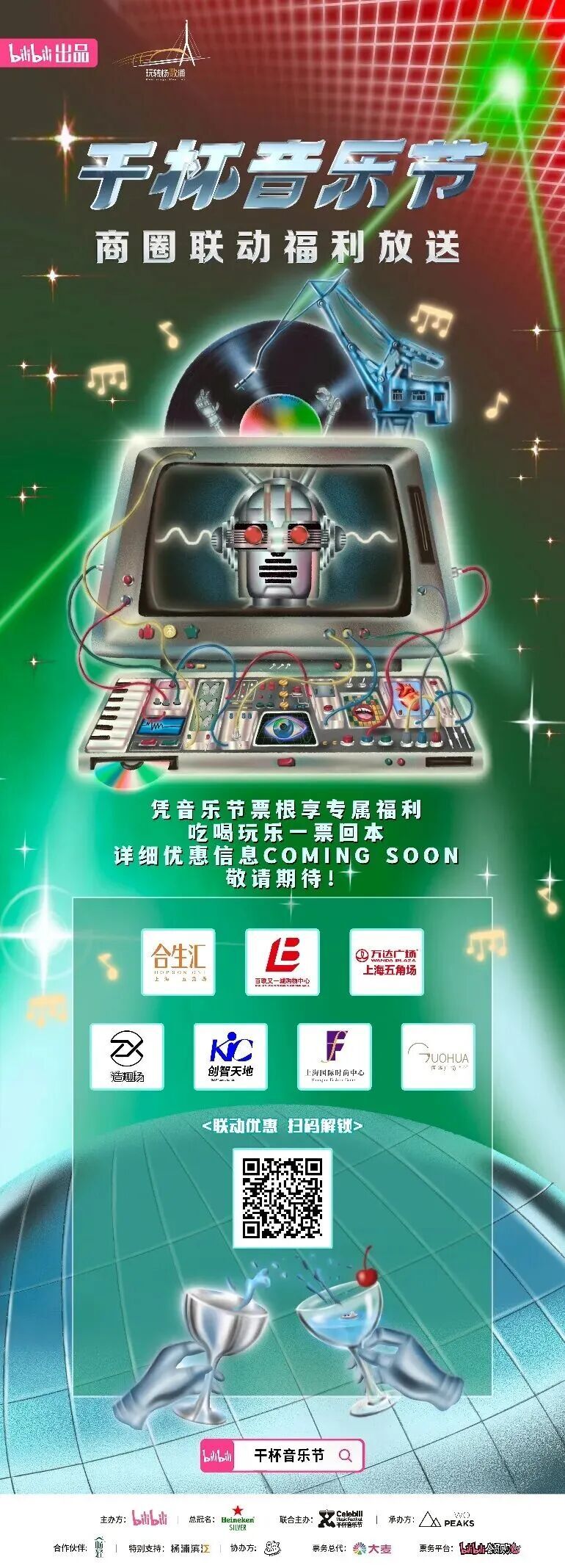 不仅如此,干杯音乐节期间,手中的票根不仅能观众“嗨”玩音乐节,还可以解锁百联又一城、合生汇、万达、国华广场等联动商场的专属福利,实现吃喝玩乐购一站式满足,欢乐不停!