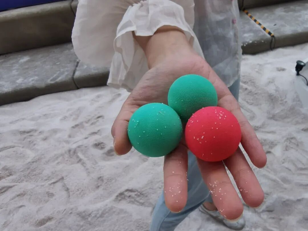 沙子里埋了不少可兑换优惠券的“幸运球”,挖到就可以参与抽奖,有人光着脚丫,一遍遍“扫雷”似地玩耍。