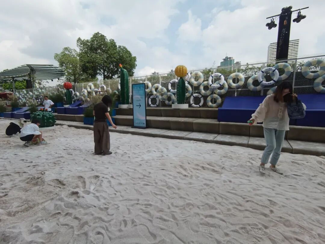 哪怕是中午时分,都能看到不少白领脱下高跟鞋、西装,在沙子上走一走、踩一踩——理由童趣又真切,“这样很解压”,“假期刚去马尔代夫,现在感觉一秒又回到了快乐时光”。