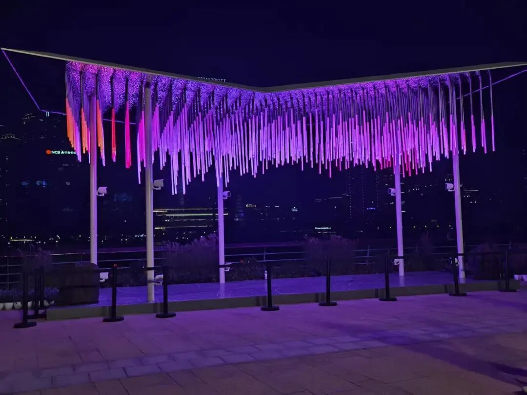 江风轻拂,音乐流淌,舞台上方,光影装置“光愈林”变换着为情绪特调的颜色,不远处,埋头看手机的少年充气模型静静坐着……一场关于城市夜晚的变革正在这里悄然发生。