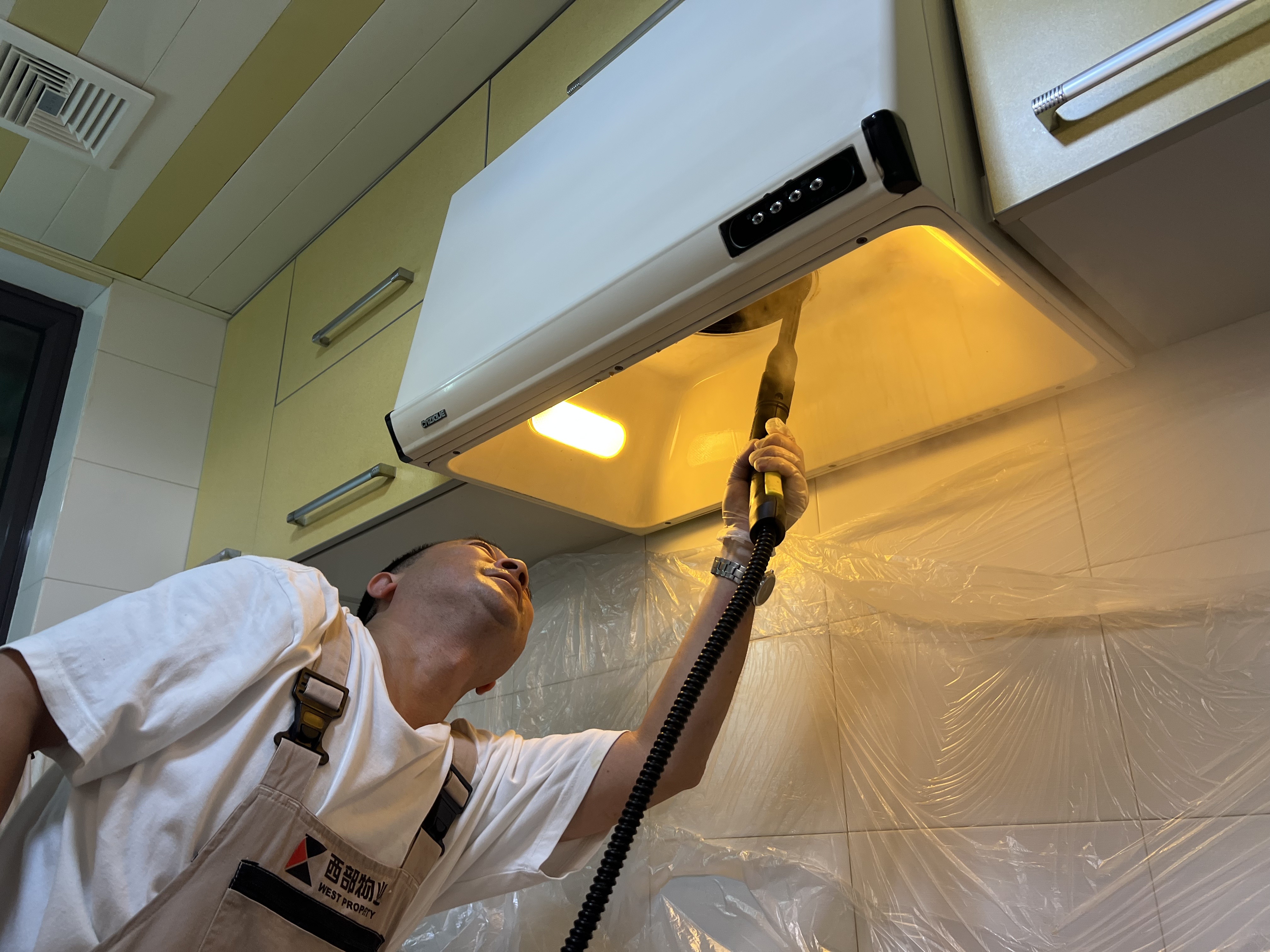下午两点,音乐广场小区业主郁先生家中,专业家政服务师正专注地进行厨房除油保洁。只见李师傅先喷上专业油污清洁剂,待油污软化后,再用140℃高温蒸汽机仔细冲刷,最后用干净的抹布擦拭。随着黏腻的黑色油垢被刮下,原先被油污覆盖的金属油烟网逐渐露出了原有的光泽。
