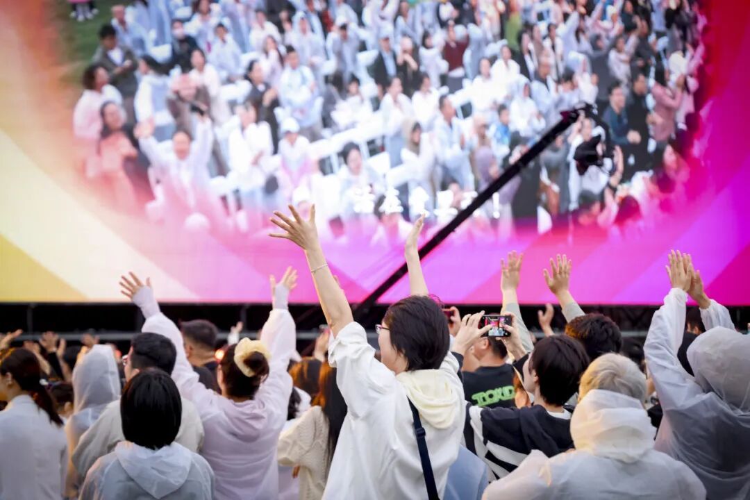 压轴曲目《活在爱里面!》唱响时,热闹的行进乐队惊喜登场,打破了舞台与观众的界限,激昂的节奏与全场大合唱交织,将现场气氛推向高潮。