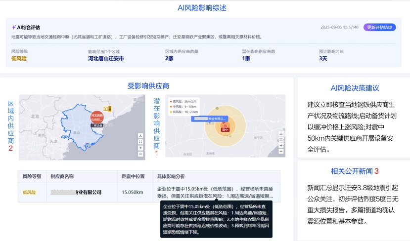 启信慧眼能够实时推送震中、震级、受影响供应商等关键信息,标出预计影响时长,并结合历史地震数据与专业评估模型,预测对供应链的潜在冲击,给出具体决策建议。比如某地发生3.8级地震,AI会综合多维度信息进行风险评级,明确标注出“两家供应商受影响、预计影响时间3天”等重要信息,同时给出企业应立即核查当地供应商生产及物流路线、启动备货计划以缓冲价格上涨风险、对震中50km内关键供应商开展设备安全评估等决策建议。