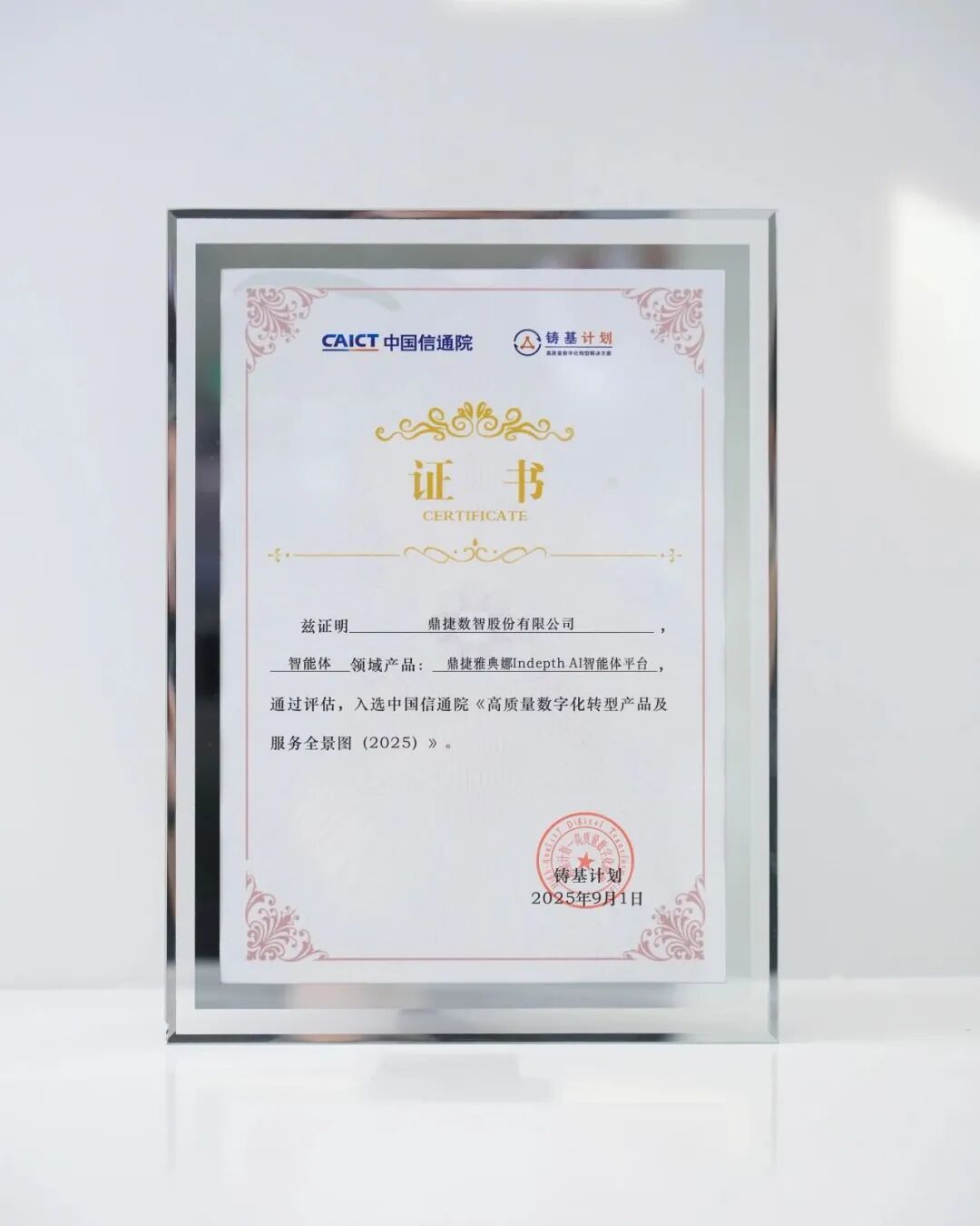 在近日中国互联网协会中小企业发展工委会主办的 2025 数字生态发展大会暨“铸基计划”年中会议上,鼎捷数智成功入选中国信通院“铸基计划”《高质量数字化转型产品及服务全景图(2025年上半年度)》,并跻身智能体、数据要素与应用、工业互联网、工业数字化等4个领域,充分彰显公司在 AI 应用领域的持续创新实践与积极推动已获得行业高标准权威认证。