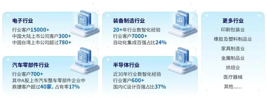 作为领先的数据和智能方案提供商,鼎捷数智在40余年的发展中积淀了深厚的行业洞察与积淀,为超过50000家客户提供了全方位的数智化转型服务。公司业务布局覆盖装备制造、汽车零部件、电子半导体等多个重点行业,其专业能力与市场地位正是获此项冠军认定的坚实基础。