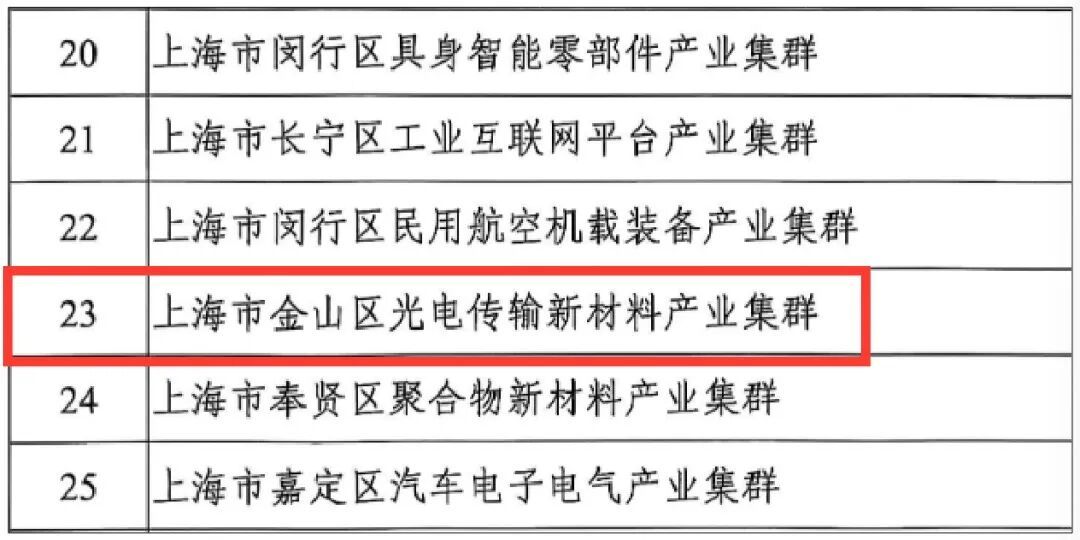 这5个集群为什么能上榜,他们都有哪些特色,我们将推出系列推文为大家介绍。前2期我们介绍了闵行区具身智能零部件产业集群、民用航空机载装备产业集群和长宁区工业互联网平台产业集群,今天我们继续了解金山区的光电传输新材料产业集群。
