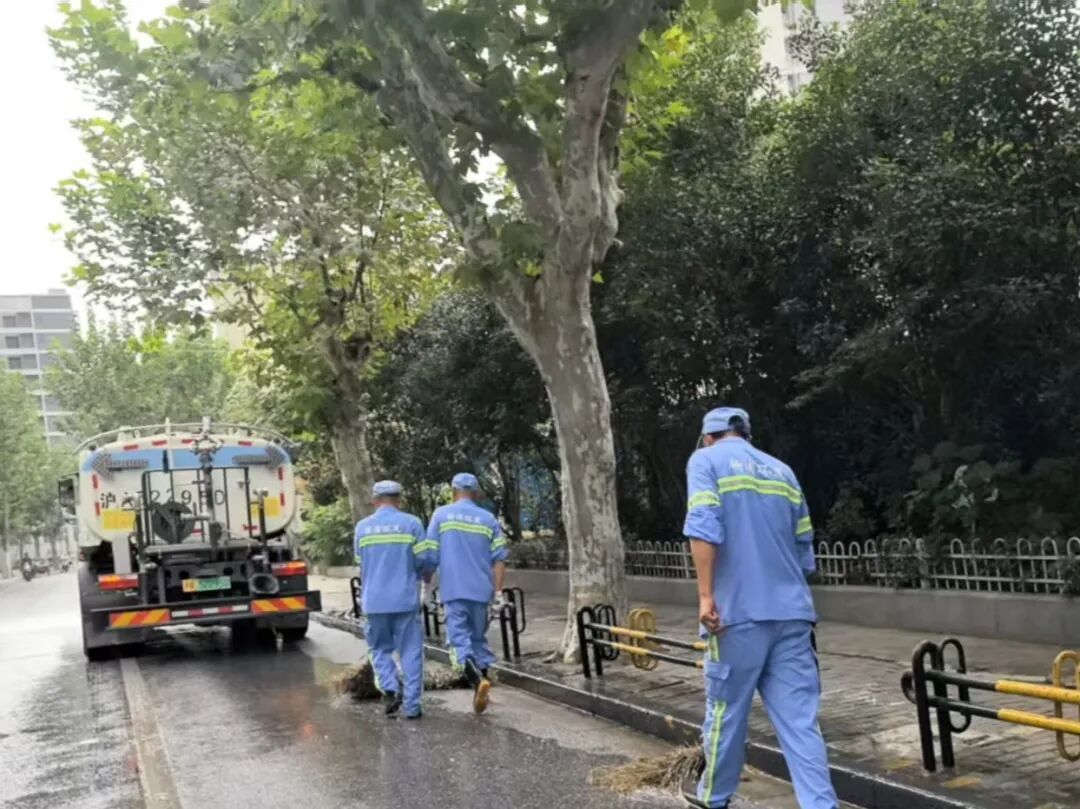 针对城市主要道路、景观区域、轨交站点出入口等地,环卫作业人员开展重点清洁整治,采取“人工+机械”协同模式开展深度清洁,重点冲洗路沿石、沟底、人行道等不洁区域。“洒水车+人工推扫”联合作业模式,洒水车在前先行冲洗路面,环卫作业人员紧随其后用扫帚推扫积水与泥沙,彻底消除卫生死角盲区,还原路面本色。