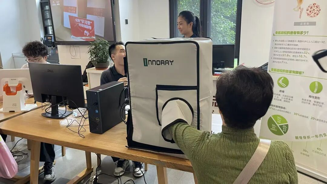 活动现场提供超声骨密度检测和X光骨密度检测服务,通过专业设备快速评估骨骼健康状况。许多上了年纪的社区居民纷纷排队等候检查。徐阿姨近年来总觉得腰酸背痛,但没有当一回事,今天一查才知道,自己是骨质疏松症,赶紧向义诊专家进行咨询。