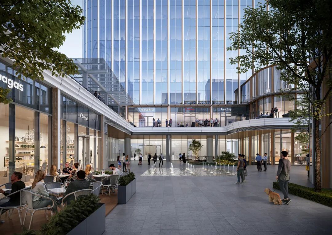 裙楼商业融合生活与商务于一体,灵活布局连接办公塔楼与公共空间。下沉庭院紧邻地铁,二层步行连廊与GATE M华之门广场(在建)相串联。两层地下车库拥有停车位超千个。多层次公共空间自然延展,打造开放、高效的商务与生活生态圈。
