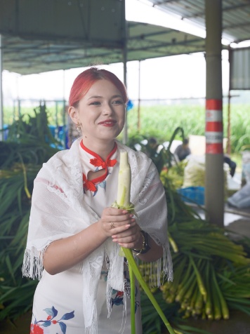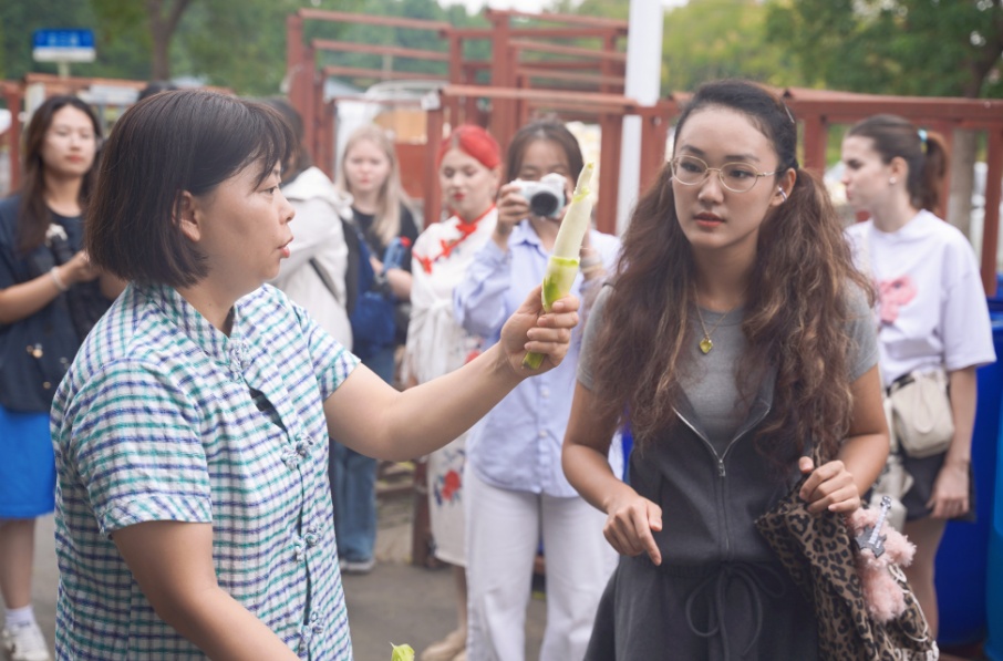 在“练塘土布染织技艺”非物质文化遗产代表性传承人沈佳慧的带领下,留学生们首先来到东泖村的茭白田与合作社,感受茭香四溢。当听说眼前形似嫩笋、裹着青绿外衣的茭白能直接生吃时,大家顿时好奇不已,纷纷伸手掰下尝鲜。“口感脆脆的,还带着自然的清甜!”一位留学生尝过后,立刻兴奋地竖起大拇指,眼里满是惊喜。