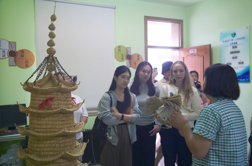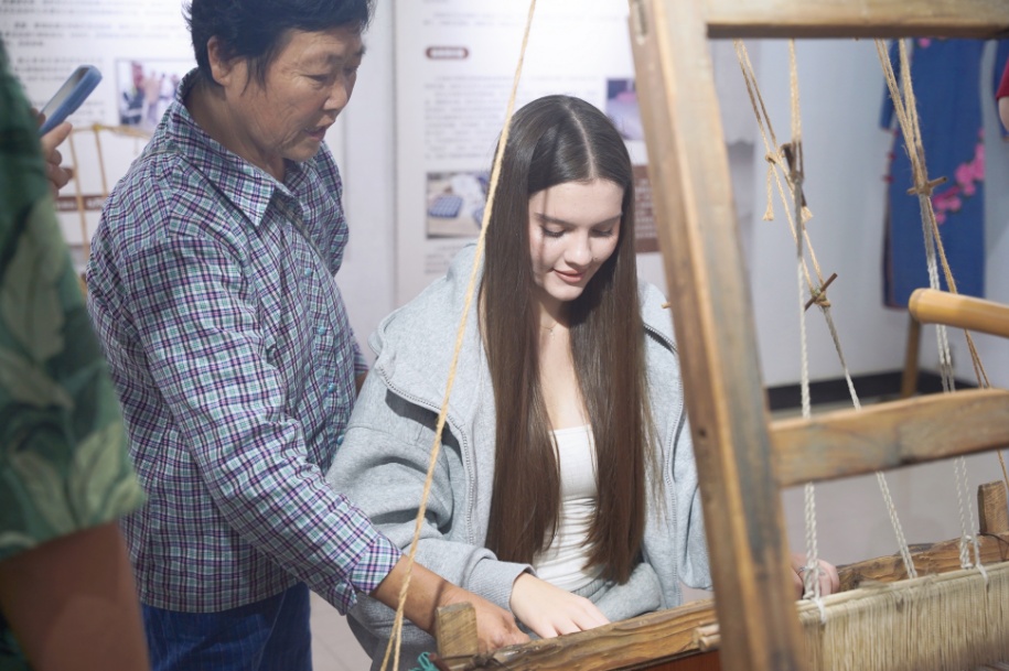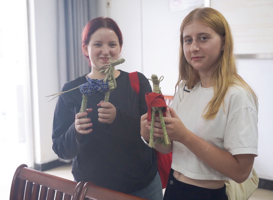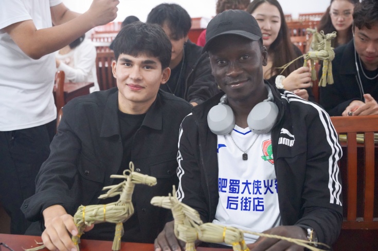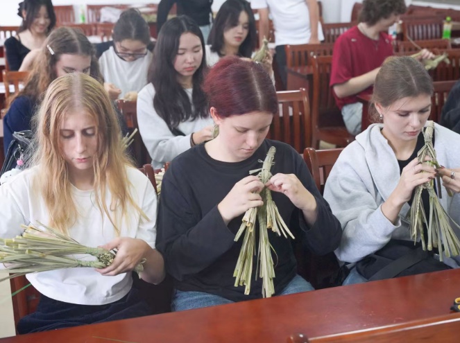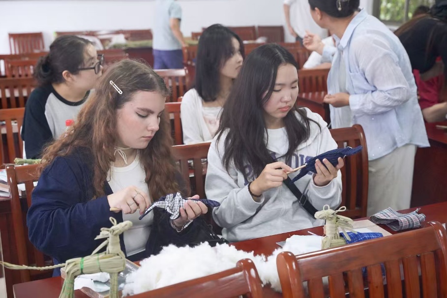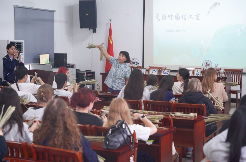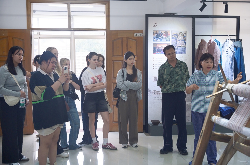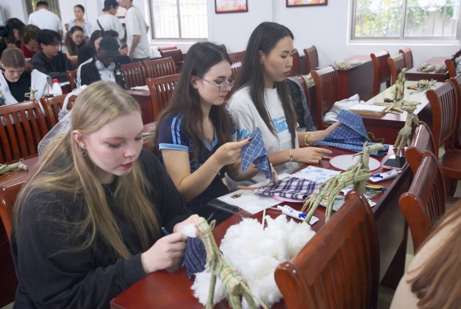 随后,留学生们沉浸式体验了茭白叶编结与土布染织两项当地非遗技艺。指尖翻飞间,原本平平无奇的茭白叶渐渐化作灵动的小物件;脚踏织布机时,木梭穿梭伴着规律的咔嗒声,每一个动作都满是新奇。大家专注学习、不时互相交流,现场欢声笑语与非遗技艺的古韵交织,大家都深深沉浸在亲手创造的成就感里。