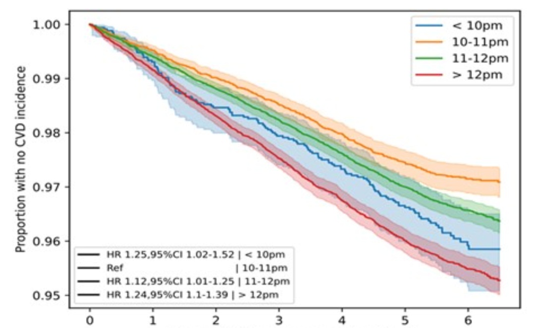 Kaplan–Meier曲线展示了心血管疾病发病率随时间推移的情况,并根据睡眠开始时间进行了细分