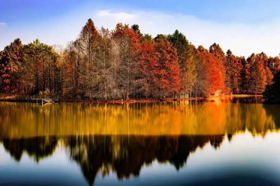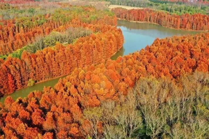 来到上海海湾国家森林公园,这里正上演着另一场沉稳而深邃的秋日变装。随着气温下降,水上森林逐渐由绿转为赭红、古铜色,笔直的树木矗立于静谧的水中,树影婆娑,倒影清晰,营造出一种静谧而庄严的氛围。阳光透过林间缝隙洒下,水面与林中小道形成美妙的光影效果,宛如行走在一幅古典油画之中。