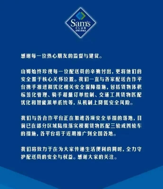 10月22日,山姆就此事件发出回应称,山姆始终珍视每一位配送员的辛勤付出,更将他们的安全置于核心关怀位置,“我们一直与各家配送合作平台携手推进和优化相关安全保障措施,包括货物体积标签化管理、骑手超量订单控制、交通工具货物匹配优化和智能派单系统等,从机制上降低安全风险。”