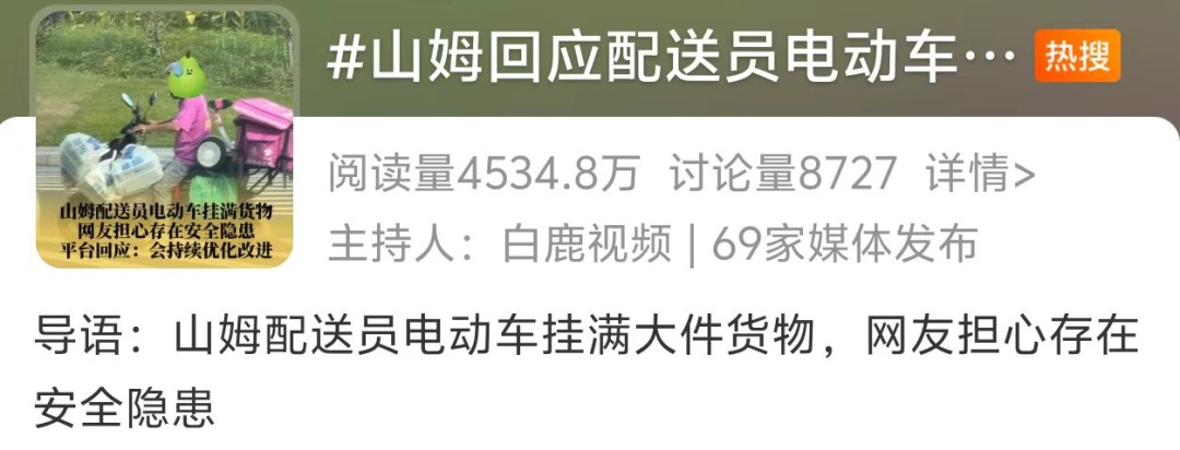 有网友称,山姆会员店主打家庭量贩装商品,商品普遍体积大、重量沉,仅依靠电动车进行派送,极易导致车辆平衡失控,存在明显的道路交通安全隐患。