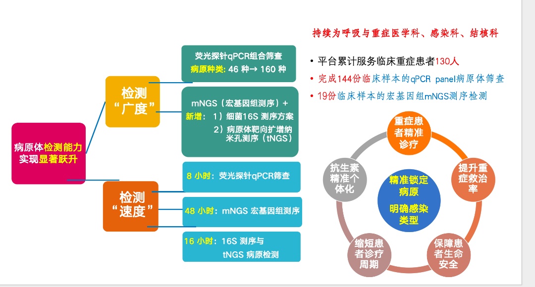 同时,项目通过升级病原检测技术,提升诊疗效率。项目团队优化了荧光探针组合筛查与三代纳米孔测序技术,实现检测“广度”与“速度”双重突破:荧光探针组合筛查覆盖病原体种类从46种扩展至160种,最快8小时出结果。同时,三代测序在mNGS技术基础上,开发细菌快速诊断16S测序方案及覆盖363种已知病原体的靶向扩增纳米孔测序(tNGS)技术,最快16小时内反馈16S测序与tNGS结果,48小时内完成mNGS宏基因组测序报告。技术升级大幅缩短诊断周期,为重症患者诊疗争取时间,提升疑难重症救治能力。