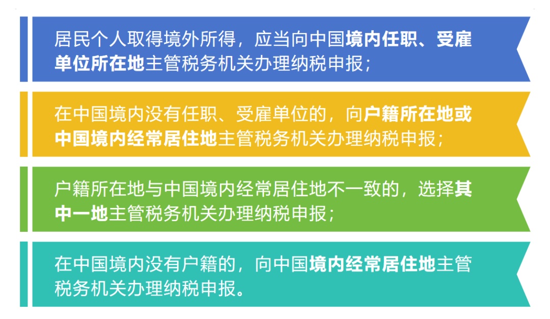 居民个人取得境外所得,应当向中国境内任职、受雇单位所在地主管税务机关办理纳税申报;在中国境内没有任职、受雇单位的,向户籍所在地或中国境内经常居住地主管税务机关办理纳税申报;户籍所在地与中国境内经常居住地不一致的,选择其中一地主管税务机关办理纳税申报;在中国境内没有户籍的,向中国境内经常居住地主管税务机关办理纳税申报。