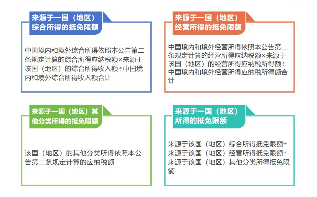 来源于一国(地区)所得的抵免限额=来源于该国(地区)综合所得抵免限额+来源于该国(地区)经营所得抵免限额+来源于该国(地区)其他分类所得抵免限额