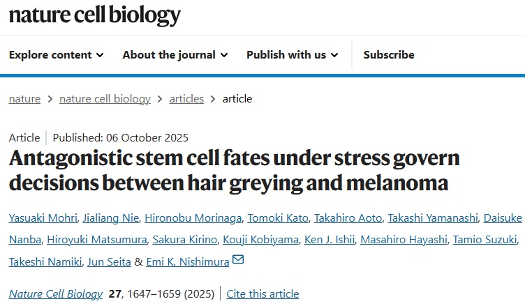 日前,东京大学研究团队在《自然·细胞生物学》上发表的一项突破性研究,首次揭示了黑色素干细胞在应激状态下通过拮抗命运抉择,调控白发形成与黑色素瘤发生的核心机制,不仅颠覆了传统认知,更揭示了人体通过自我牺牲机制预防癌症的精妙设计,为理解衰老表型与癌症发生的内在关联提供了全新视角。