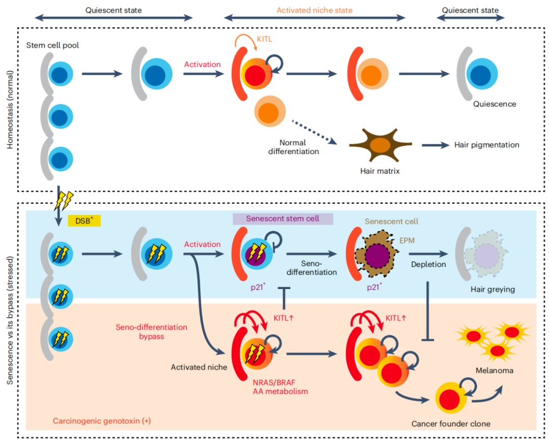 当面临电离辐射、化疗药物等引发的DNA双链断裂这类严重损伤时,McSC会激活细胞内的p53-p21信号通路,启动一种独特的“衰老-分化”程序——既进入细胞衰老状态,又同时加速分化为成熟黑色素细胞。这种双重机制最终导致McSC被耗竭,无法再为新生毛发提供色素,最终表现为局部头发变白。但与此同时,这种程序性细胞耗竭有效阻止了受损细胞的异常增殖,从而降低了黑色素瘤的发生风险。