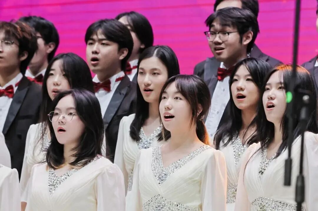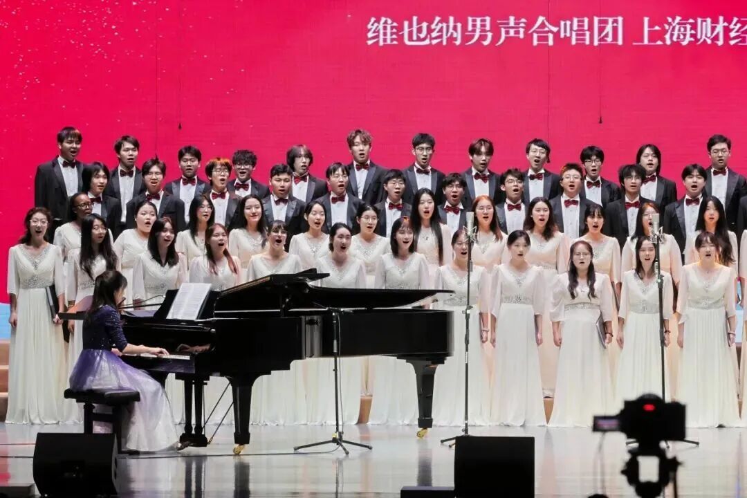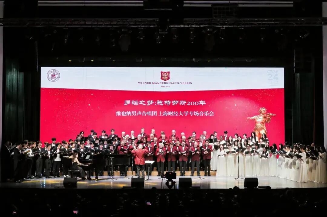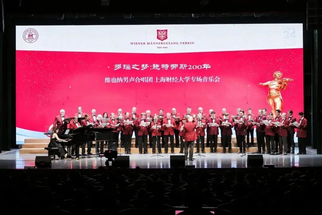 金秋十月,正值党的二十届四中全会胜利闭幕之际,上海财经大学艺术中心迎来了一场意义非凡的音乐盛宴。被誉为奥地利“文化使者”的维也纳男声合唱团携手上海财经大学学生合唱团,共同呈现《多瑙之梦》专场音乐会,为师生们带来了一场世界顶级的艺术盛宴。校党委副书记周国良,校长助理、教务处处长夏纪军,党委常委、宣传部部长曹东勃及校内师生代表、附属学校师生代表等近千人现场观演。 维也纳男声合唱团团员来自奥地利、德国、中国等多个国家,音乐会上,他们重现了1867年由该团首演、小约翰·施特劳斯为其量身创作的《蓝色多瑙河圆舞曲》合唱原版,让观众仿佛置身于多瑙河畔,感受那波光粼粼的浪漫与激情。此外,合唱团还演绎了《水手合唱》《青年漫游》等经典曲目,展现了绵延百年的艺术纽带。