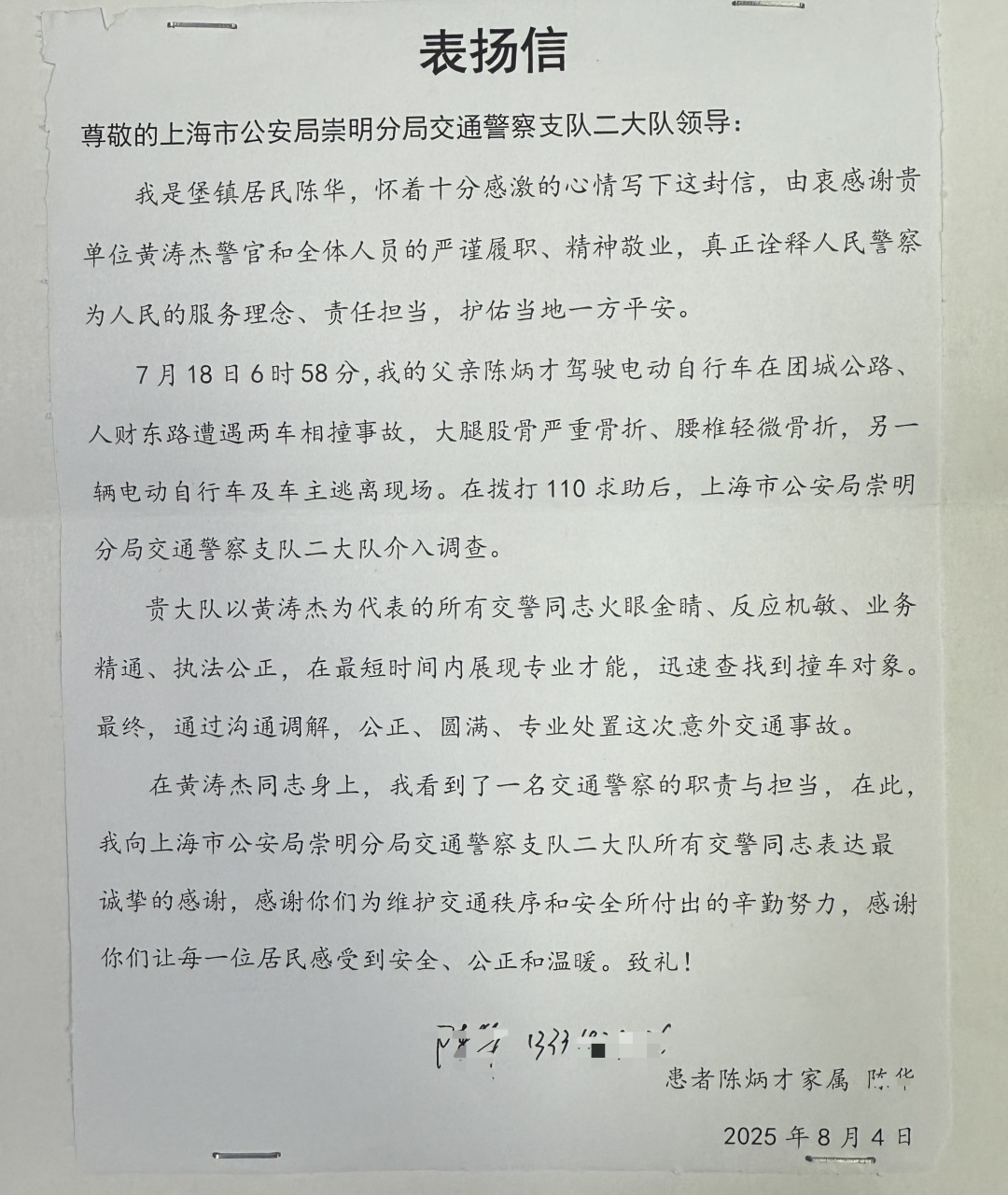 受害者家属在感谢信中动情地写道:“在黄涛杰同志身上,我们看到的不仅是一名警察的职责,更是一位为人民遮风挡雨的贴心人......”