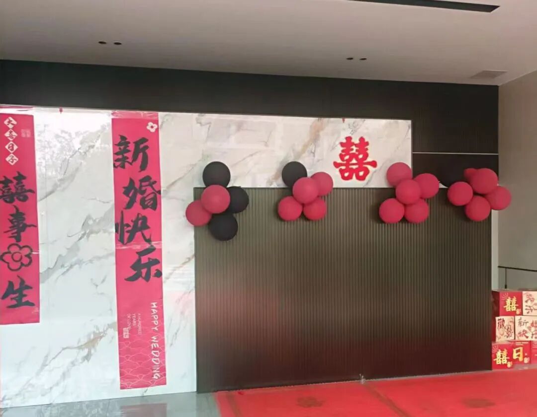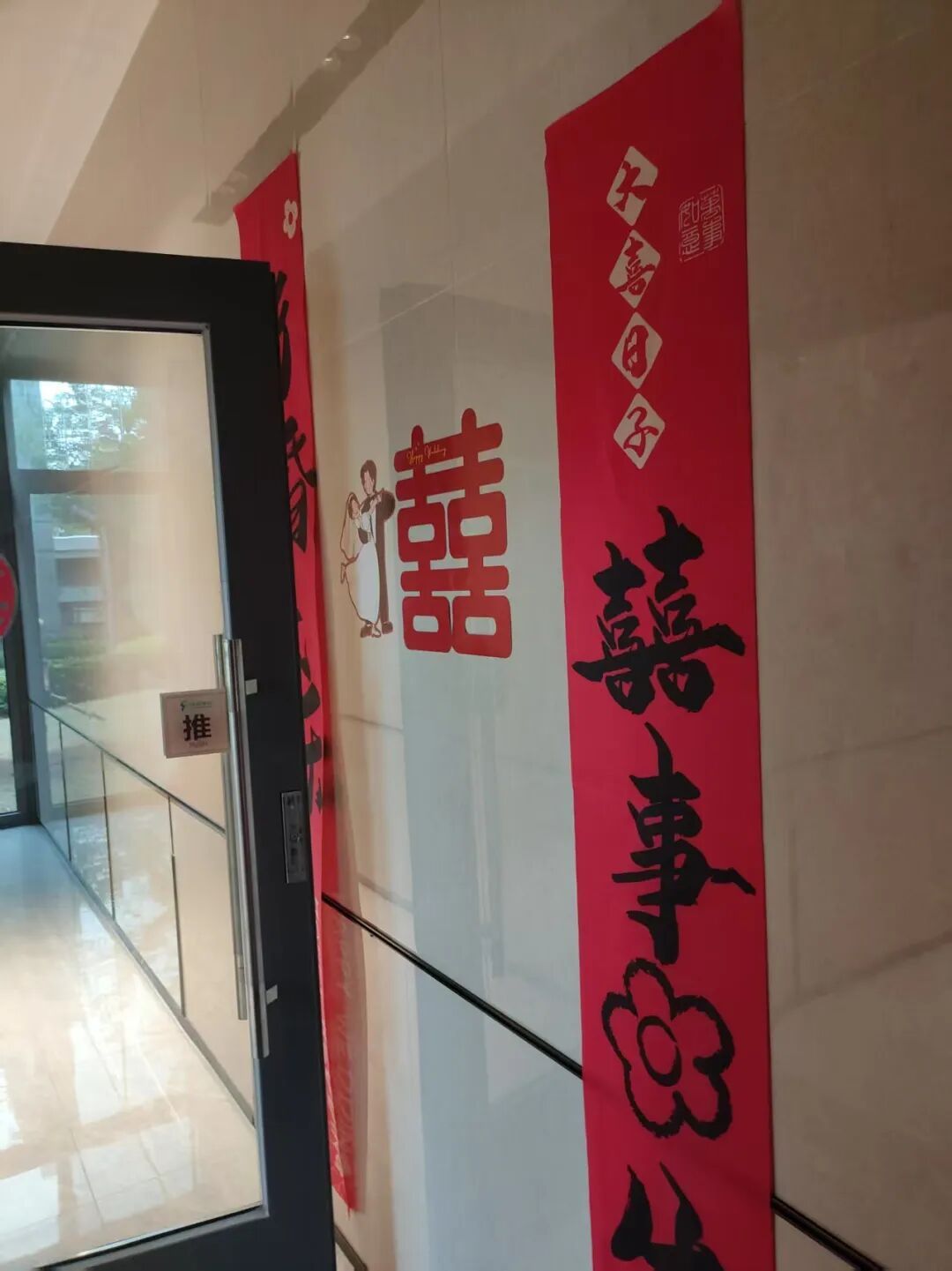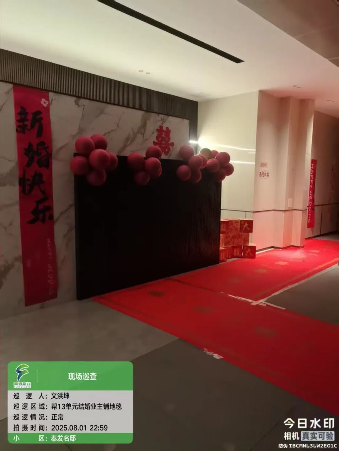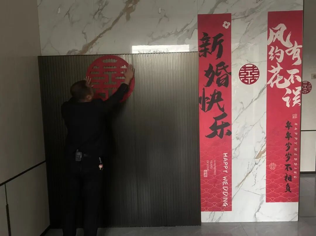 工作人员提前一天围绕“小区主干道—单元门厅—电梯桥箱”的路线,重点进行精致清洁,在确保整体环境整洁后,小心翼翼地在门厅中贴上大气美观的喜字、精巧的窗花,并悬挂上气球等象征吉祥的红色装饰。每一个细节都力求完美,只为让新人与家人在第二天清晨出门时,能收获一份满满的惊喜。