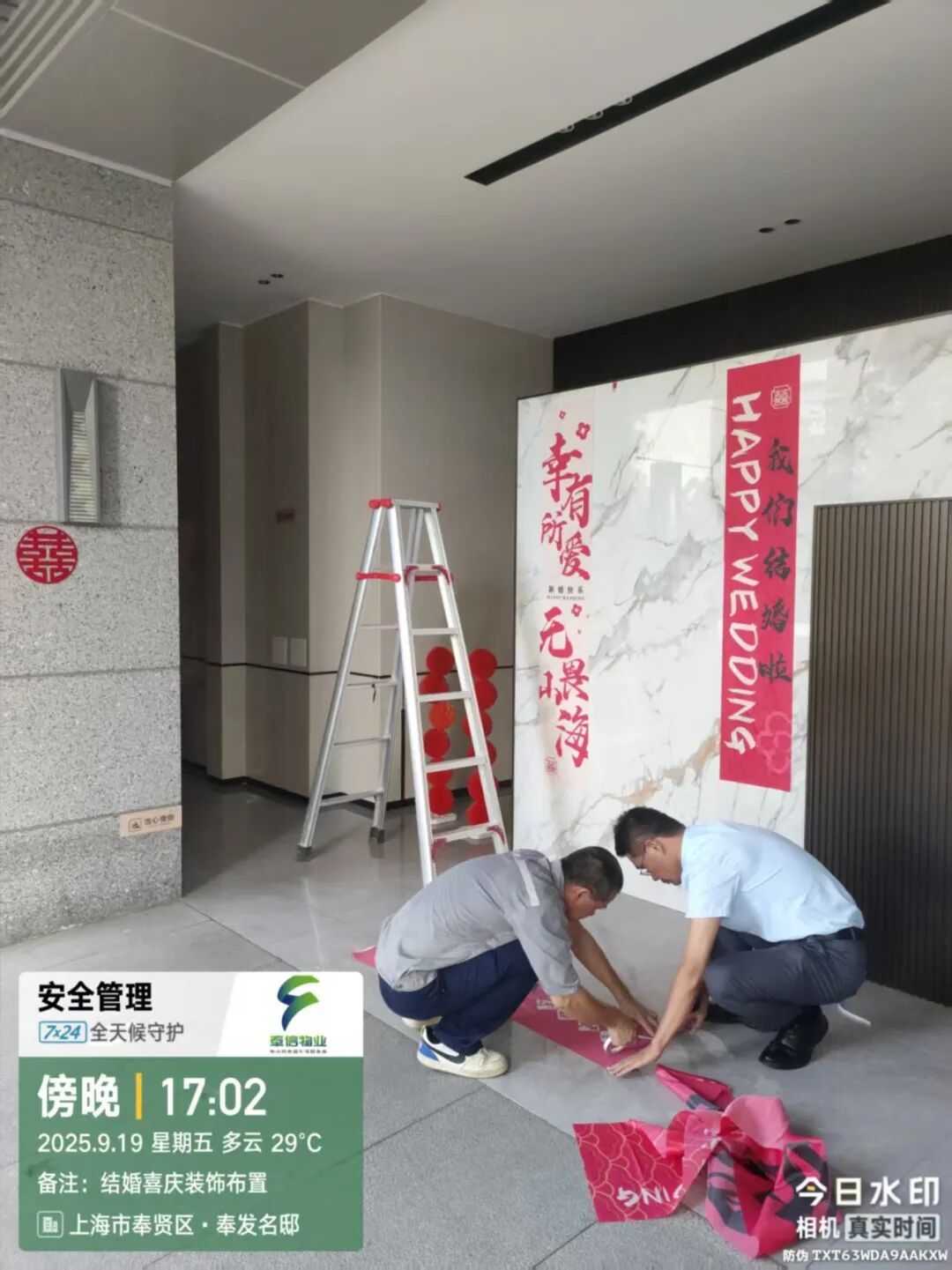 在避免影响其他业主们日常出行的前提下,奉贤区奉信物业奉发名邸物业服务中心为新婚业主提供了婚庆布置服务。