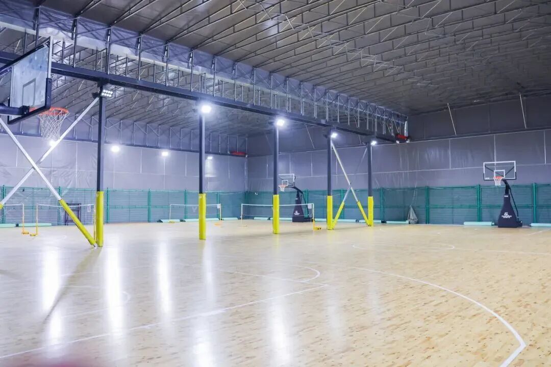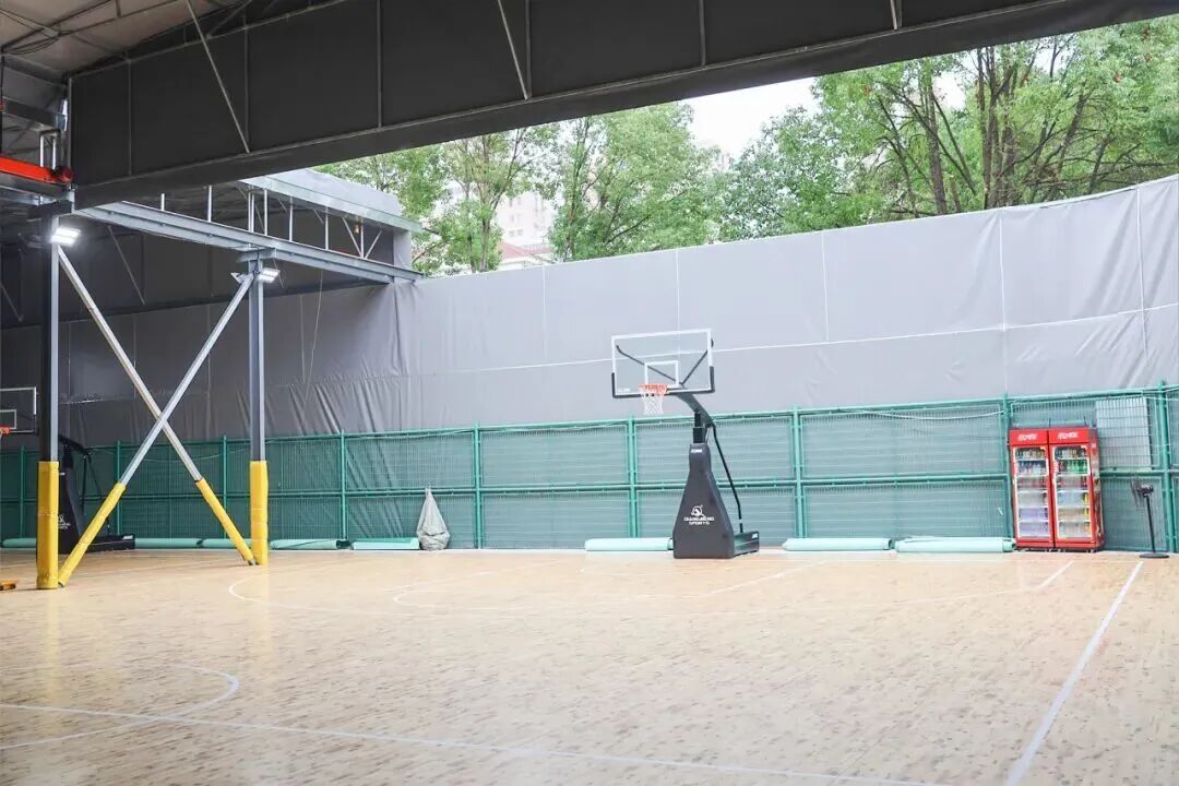 在露天球场设计加装了电动遥控可伸缩顶棚,以解决露天篮球场受天气影响大、地面状况不佳等问题,使其具备防风、防雨及排水能力,无惧气候变化。同时,场地内全面铺设了专业篮球木地板,显著提升运动弹性、防滑性与安全性,有效降低运动损伤风险,市民可全身心投入,畅享运动乐趣。