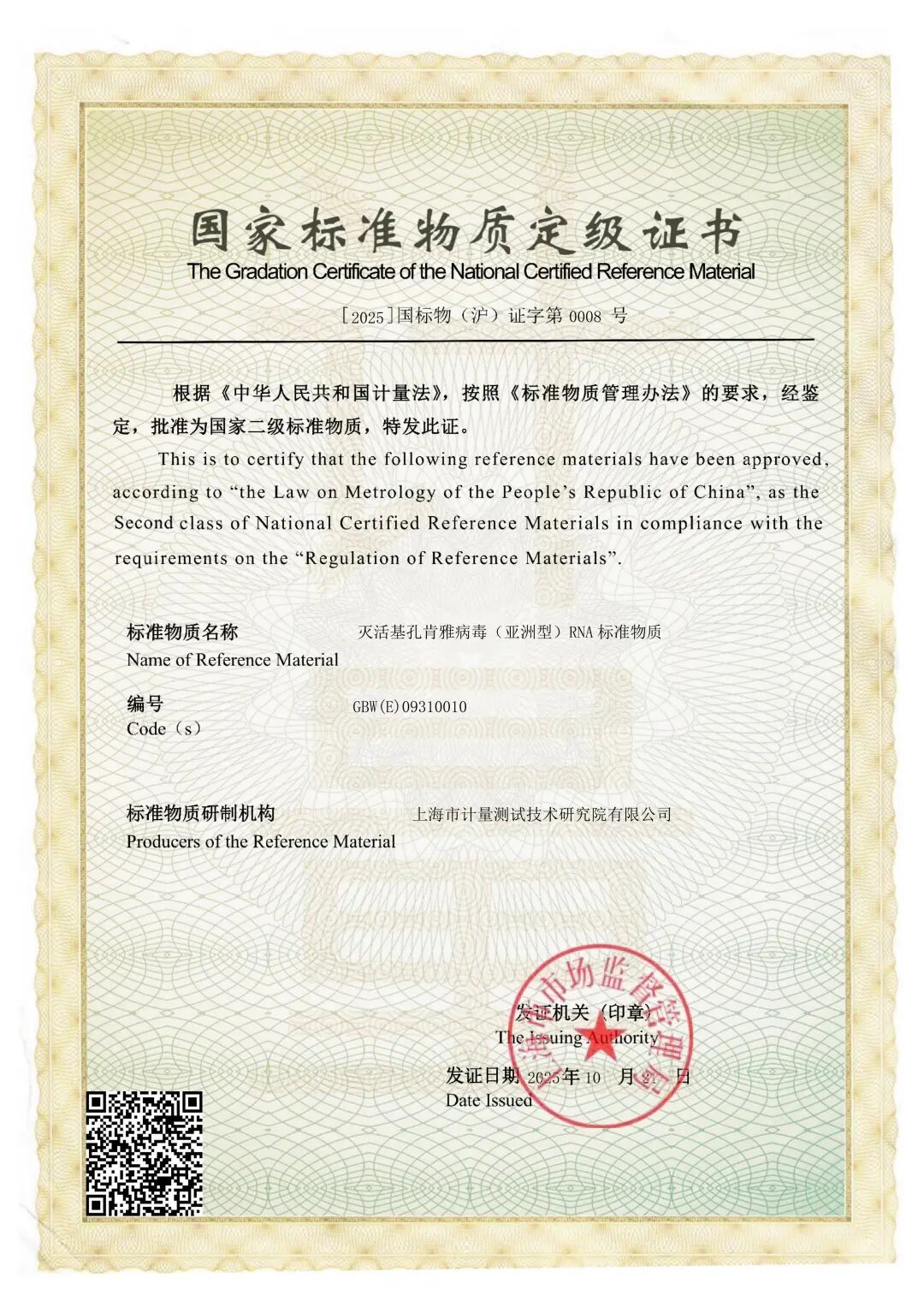 近日,由上海市计量测试技术研究院有限公司研制的“灭活基孔肯雅病毒(ECSA-IOL)RNA标准物质”与“灭活基孔肯雅病毒(亚洲型)RNA标准物质”正式获批,成为国内首批灭活基孔肯雅病毒形式的国家二级标准物质。本项目的开展受到国家市场监督管理总局的支持,并由昆明理工大学,上海疾控中心,上海临检中心,新羿生物等企事业单位共同合作完成,是国家标准物质审批权下放试点工作中的又一个典型案例。