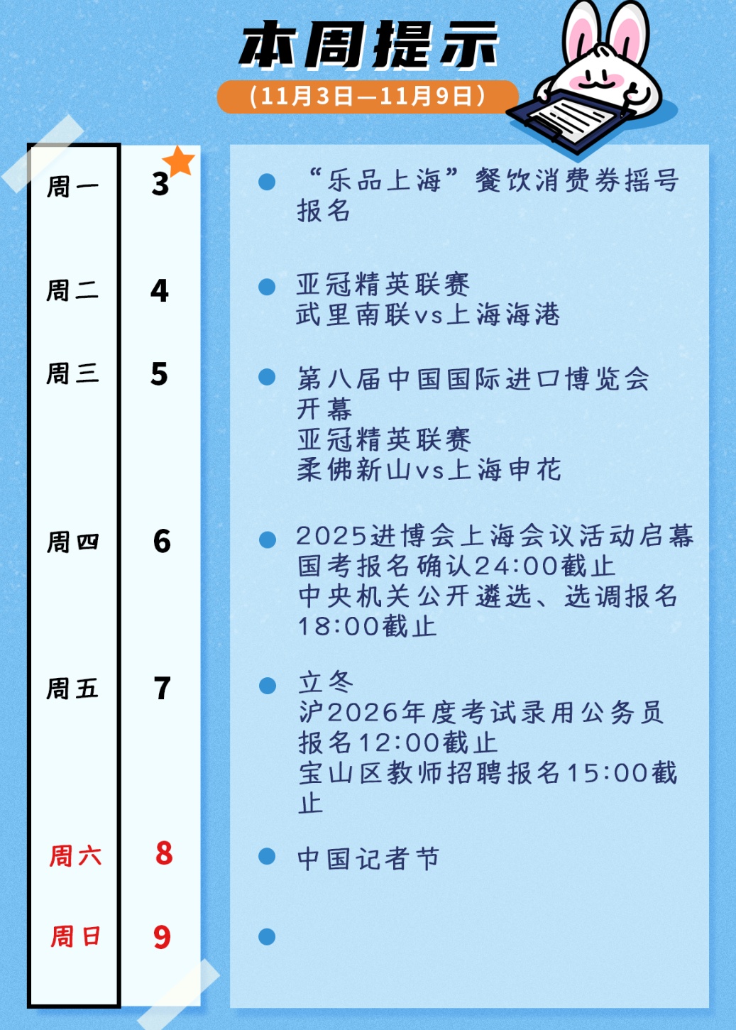 第八届进博会周三开幕,沪2026年度考试录用公务员报名周五截止,周五立冬,上海两队出战亚冠精英联赛……本周还有哪些大事?速看本周提示↓