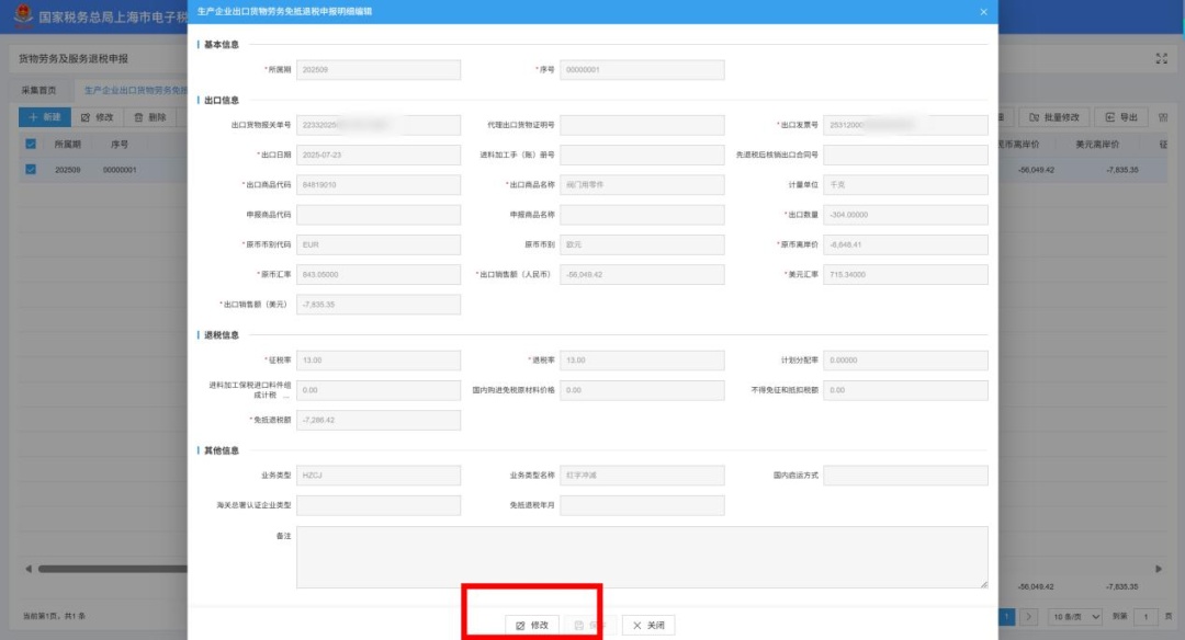 对选中的申报记录进行修改(比如将退运数量、金额等进行冲减),确认无误后点击保存。保存成功后,按照页面上方提示依次操作:确认汇总表 → 退税申报 → 申报结果查询,完成申报提交。