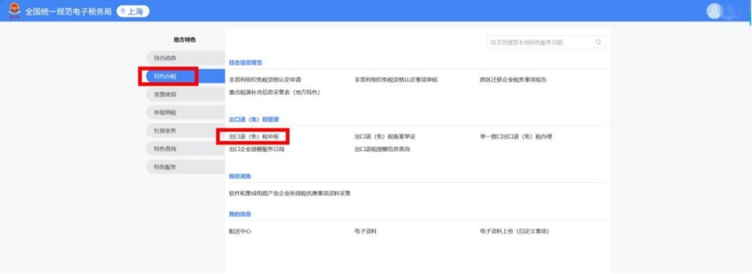 打开电子税务局,点击【地方特色】—【特色办税】—【出口退(免)税申报】。