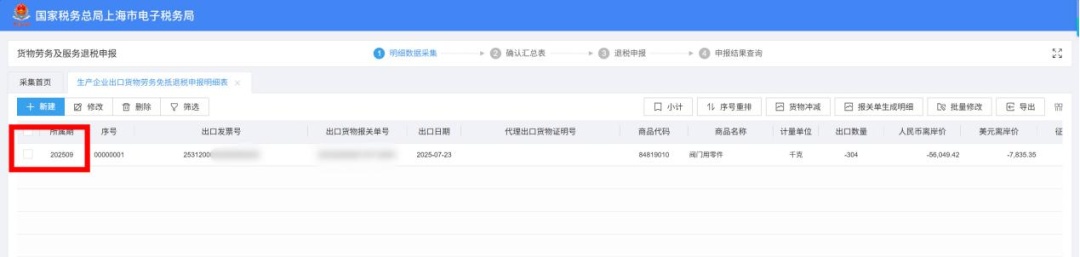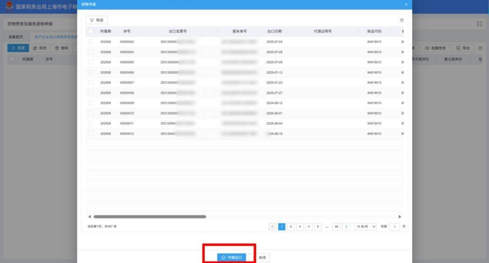 系统将展示历史申报记录,找到需要冲减的那条出口记录并选中。