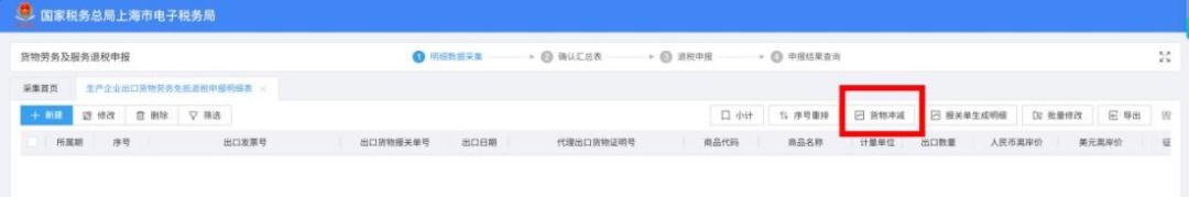 进入后选择【免抵退税申报】—【在线申报】—【生产企业出口货物劳务免抵退税申报明细表】—点击【货物冲减】按钮。