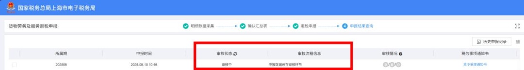 提交成功后,系统将提示“申报数据已在审核环节”,接下来耐心等待税务审核即可。