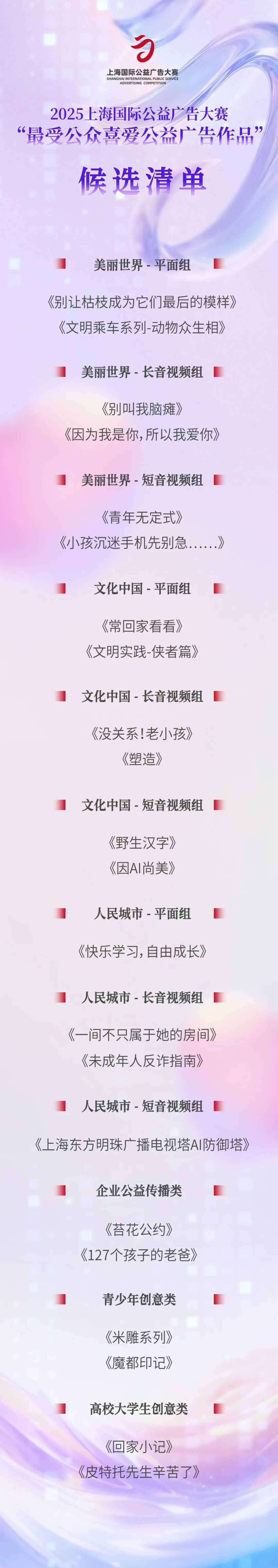 2025上海国际公益广告大赛线上公众投票通道于今日正式启动!为扩大赛事的影响力与社会参与度,推动公益理念广泛传播,大赛特别设置了“最受公众喜爱公益广告作品”奖,该奖项通过线上公众投票的形式,在大赛官方微信小程序与bilibili投票活动专题页进行评选,期待大家为心仪作品投出关键一票,以指尖之力汇聚公益声量,共同传递社会温情!