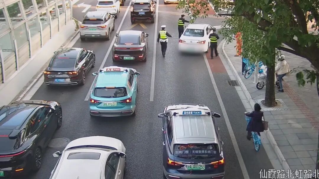 面对民警要求出示驾驶证、行驶证的要求,一小客车司机完全不配合。“这位司机听到我说的话之后,非但没有出示相关证件,而且神情看上去有点紧张。”长宁公安分局交管支队三大队民警曹栋杰说道,“他也没有停下来,大概一两秒之后,他还踩了一脚油门,车往前动了。”