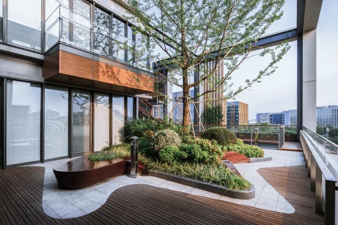 企业办公楼以“取自然之片段,展现园林之美”为核心设计理念,借助南侧竖向庭院,串联下沉庭院、空中庭院、平台与屋顶绿化,构建出层层叠绿的立体园林景观。同时,融入“树、溪、瀑、风、兰、叶、藤”7大特色主题景观,既丰富了建筑空间层次,又实现“拥禅意,顾繁华,凸显园林之美”的景观效果,让企业特色与企业文化在绿意中自然流露。