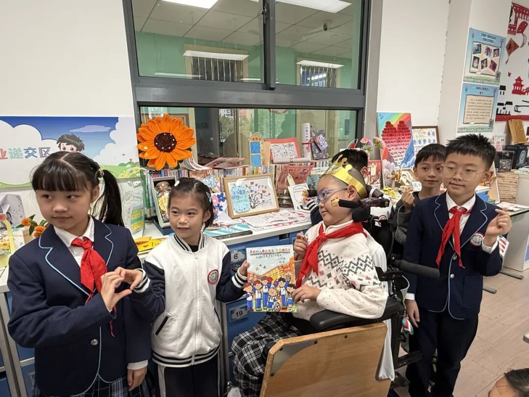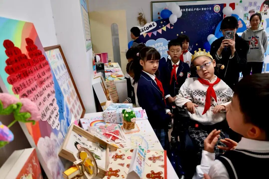 “驾驶”着电动轮椅的洛洛从这些礼物前经过,认真阅读着师生写下的祝福,一旁的同学纷纷围上去,你一言我一语,介绍着自己的心意和巧思。