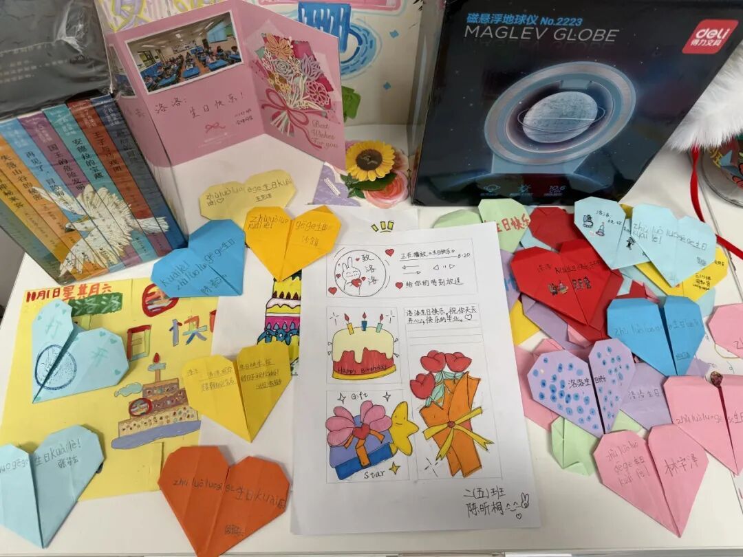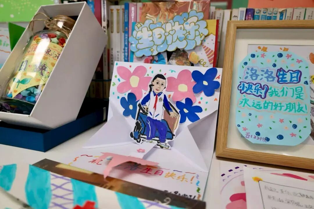 走进洛洛所在的五(4)班,一旁放书包的柜子上摆满了同学手工制作的礼物,一个个彩色的爱心折纸,上面写着最诚挚的祝福:“洛洛,祝你生日快乐!”“你是最勇敢的,今后的日子,希望你每一天都开心。”有些一年级孩子,不会写的汉字还用拼音来代替。
