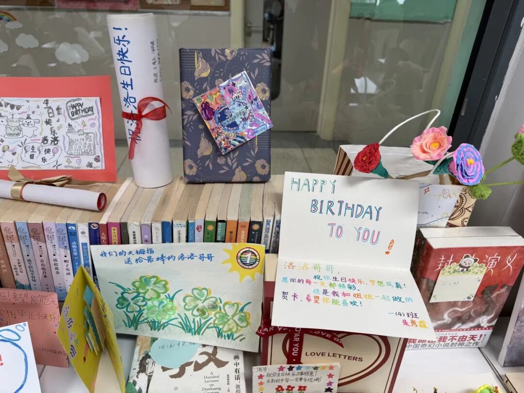 小编还看到许多制作精美的贺卡,手绘了向日葵、彩虹等图案;用扭扭棒做成的一棵柿子树,寓意着“事事如意”;将全班同学的祝福和名字汇集在一整幅画作中,希望洛洛能记着他们每一个人……