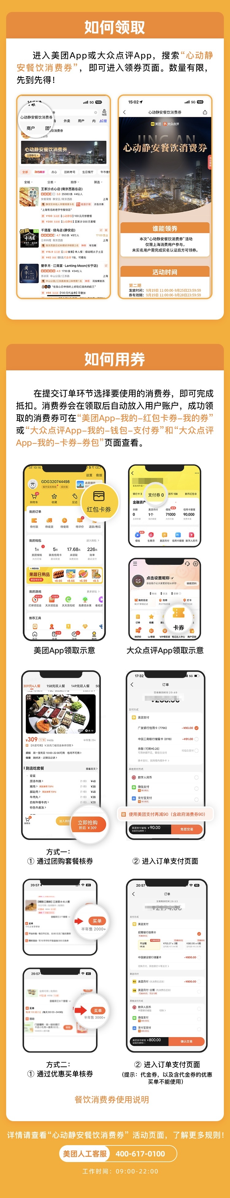 消费者可通过美团App、大众点评App搜索“心动静安餐饮消费券”,即可进入活动页,完成实名认证后可参与领券。成功领取的消费券可在“美团App-我的-红包卡券-我的券”或“大众点评App-我的-钱包-支付券”页面查看。活动期间,消费券数量有限,领完即止。消费者可在活动详情页查询消费券使用规则和参与活动商户情况。活动页面内商户均可用券。