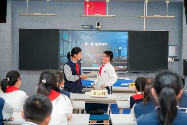 “审判长”沉稳掌控庭审节奏,“审判员”严谨审慎,“书记员”专注记录,“原告”饱含委屈地陈述,“被告”最终深刻忏悔……同学们全情投入的演绎,将庄严肃穆的庭审现场真实还原在大家面前。这场围绕校园霸凌展开的剧本,紧扣学生生活,让法律不再是书本上冰冷的条文,而是变成了可观、可感、可思的真实故事。