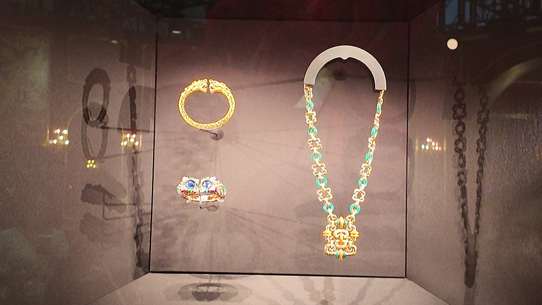 在珠宝展区,有一家专注古董珠宝的品牌,创始人有着20多年的珠宝收藏史;展出的展品中,有一款17世纪的“虾须龙镯”很是亮眼。《红楼梦》第五十二回中曾出现过“虾须镯”这个名词,因金丝细如虾须而得名,镶嵌名贵珠子,采用累丝工艺制成。