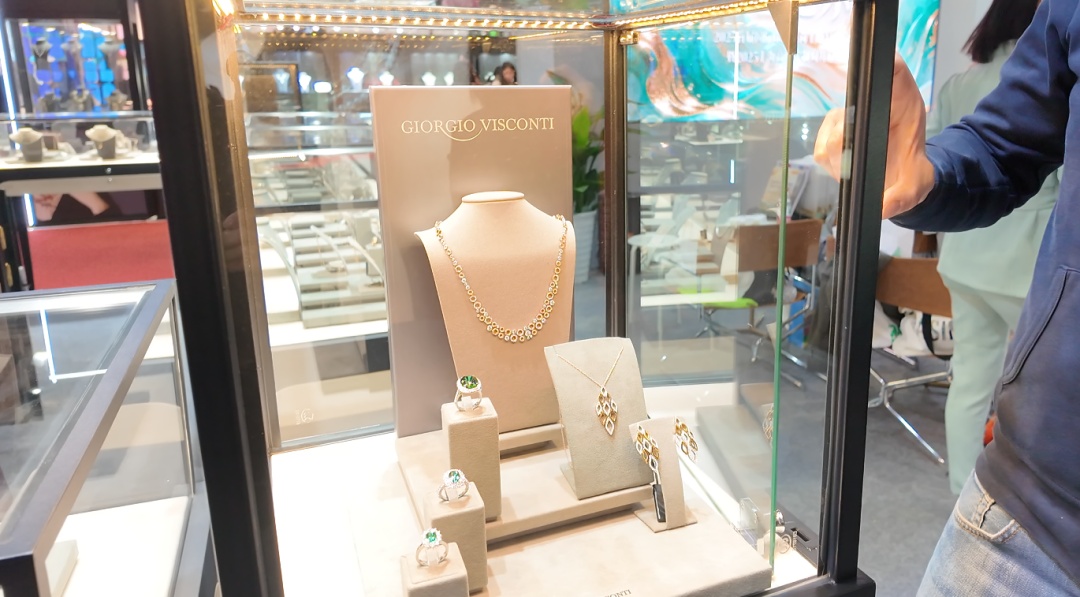 “珠光宝气”的展台上,他选出一条钻石项链开始介绍。作为即将新开的高端产品系列开篇之作,项链由159个独立部件组成,工匠手工制作耗时三周完成,仅此一条。