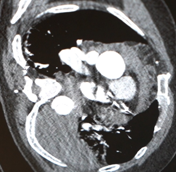急诊检查结果不容乐观:胸腹主动脉夹层伴胸腔大量积液、纵隔积液——这些积液,考虑是从撕裂的主动脉里漏出来的!